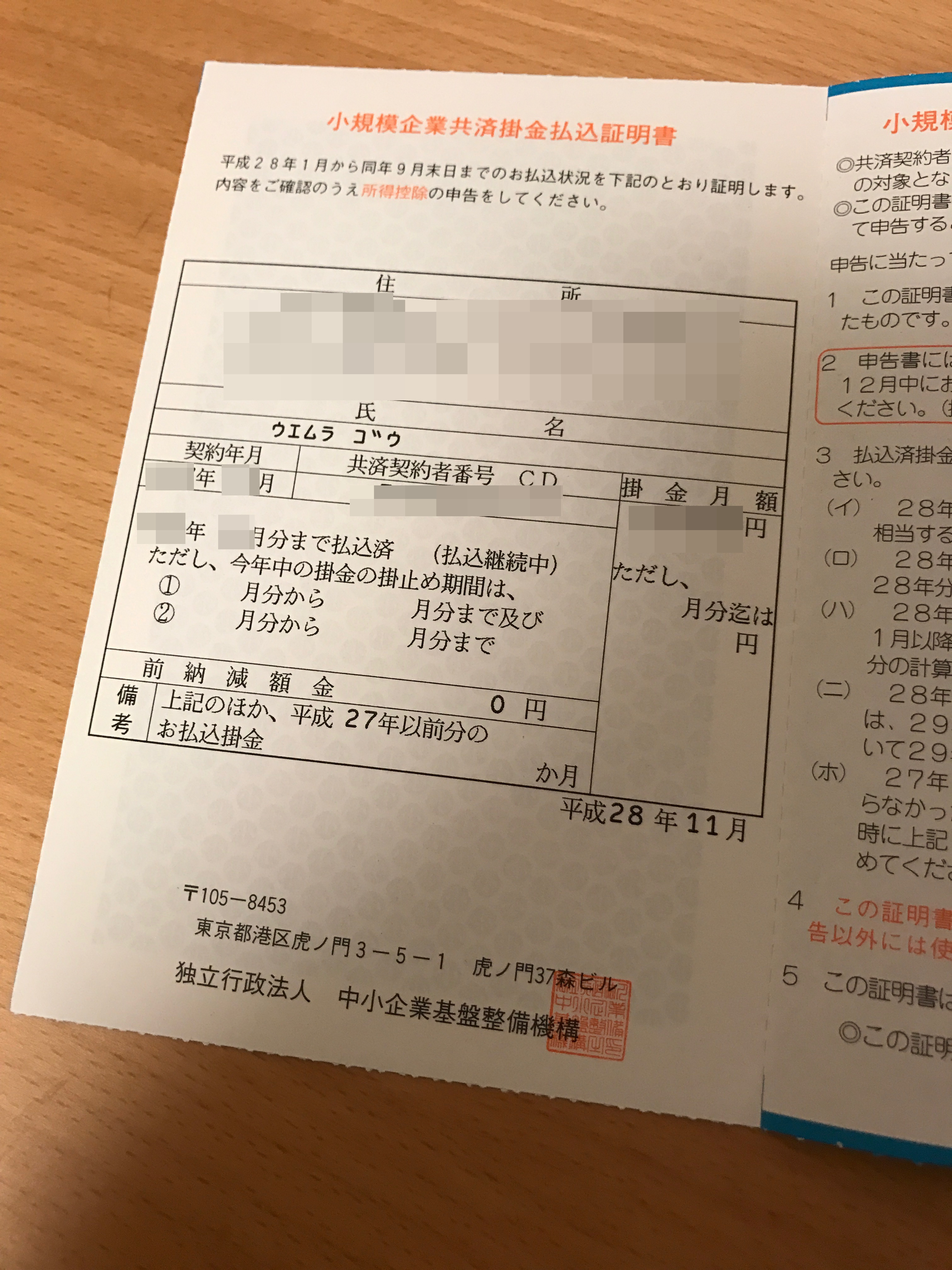小規模企業共済に加入すると、年末調整や確定申告書用に小規模企業共済の掛金払込証明書が届きます。