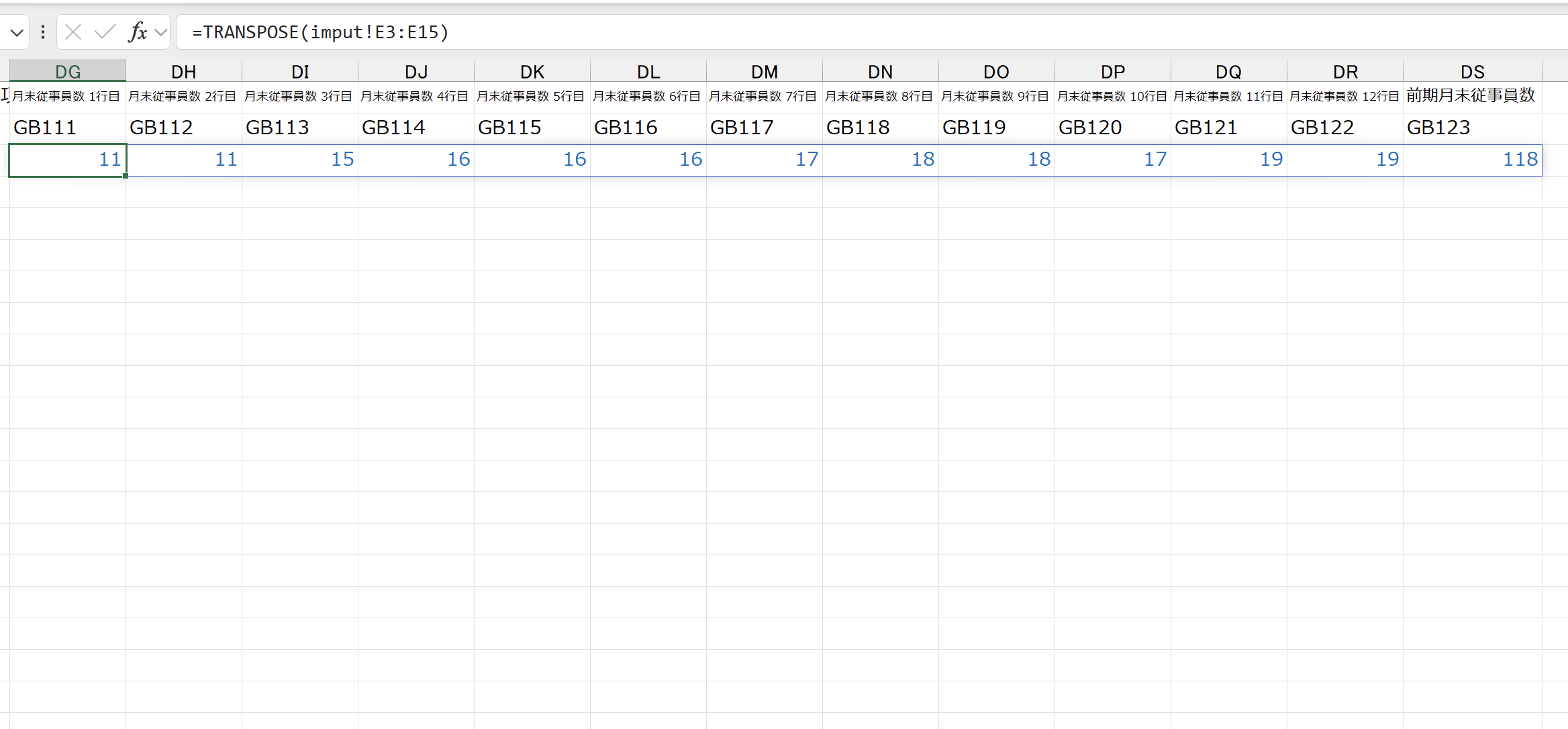 こちらも数式を横にコピーすれば、同じように縦のデータが横に並びます。