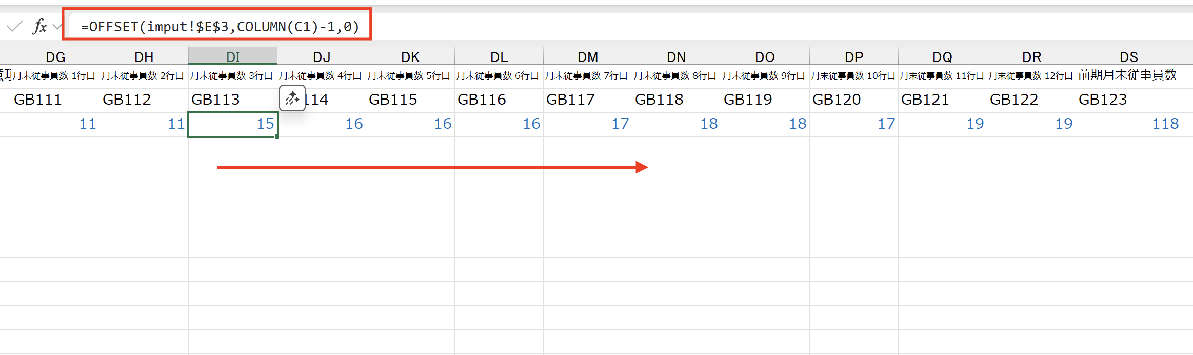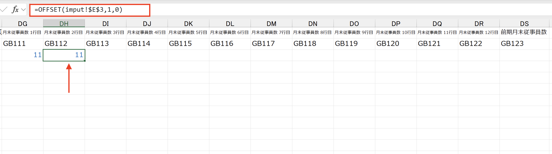 A列 | =OFFSET($E$3,0,0) | E3 | 11 |