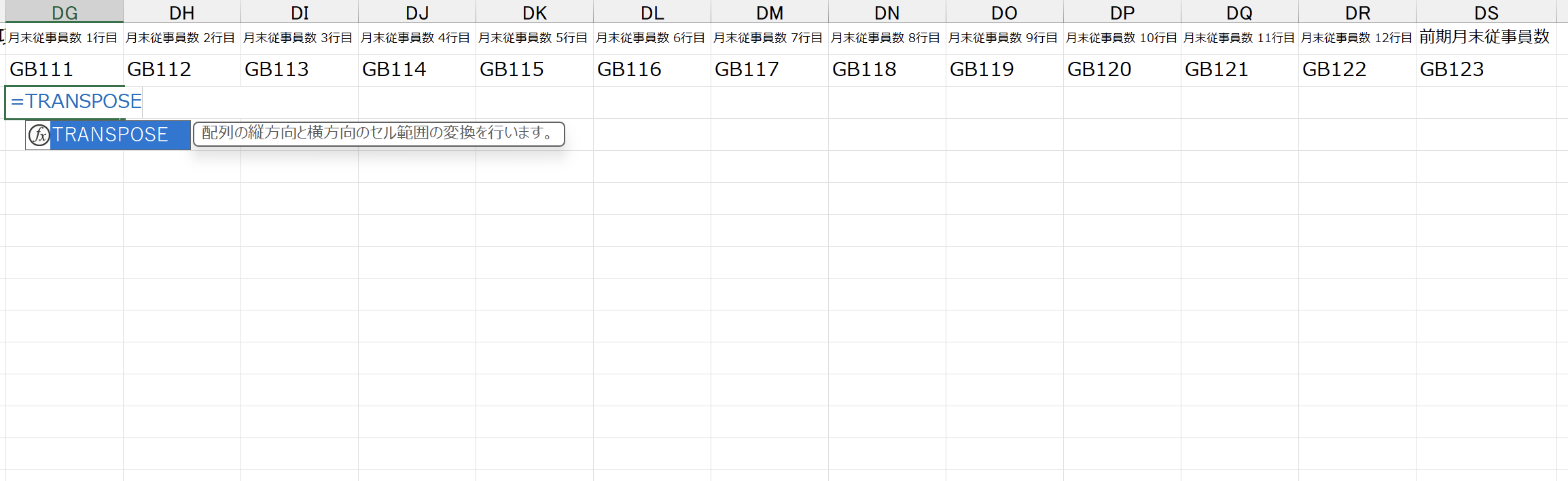 これとは別に縦のデータを一度の操作で横に並べたいなら、TRANSPOSE関数を使うと一発で並べられます。