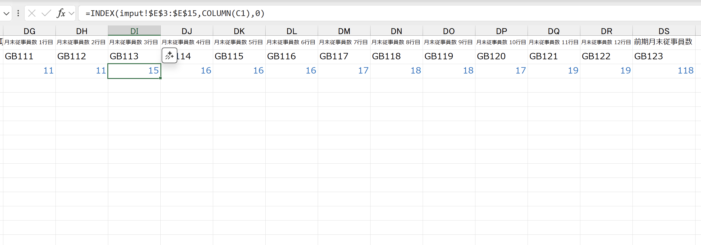 ただ、先程のOFFSETとは行番号の指定方法が違います。「COLUMN(A1)-1」とはしないで、「=INDEX(imput!$E$3:$E$15,COLUMN(A1),0)」とすれば、リストの1行目のデータとしてE3セルの値が表示されます。