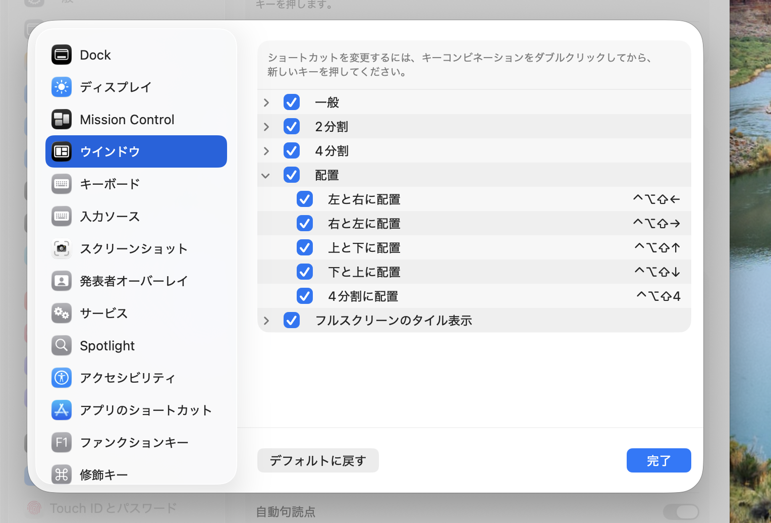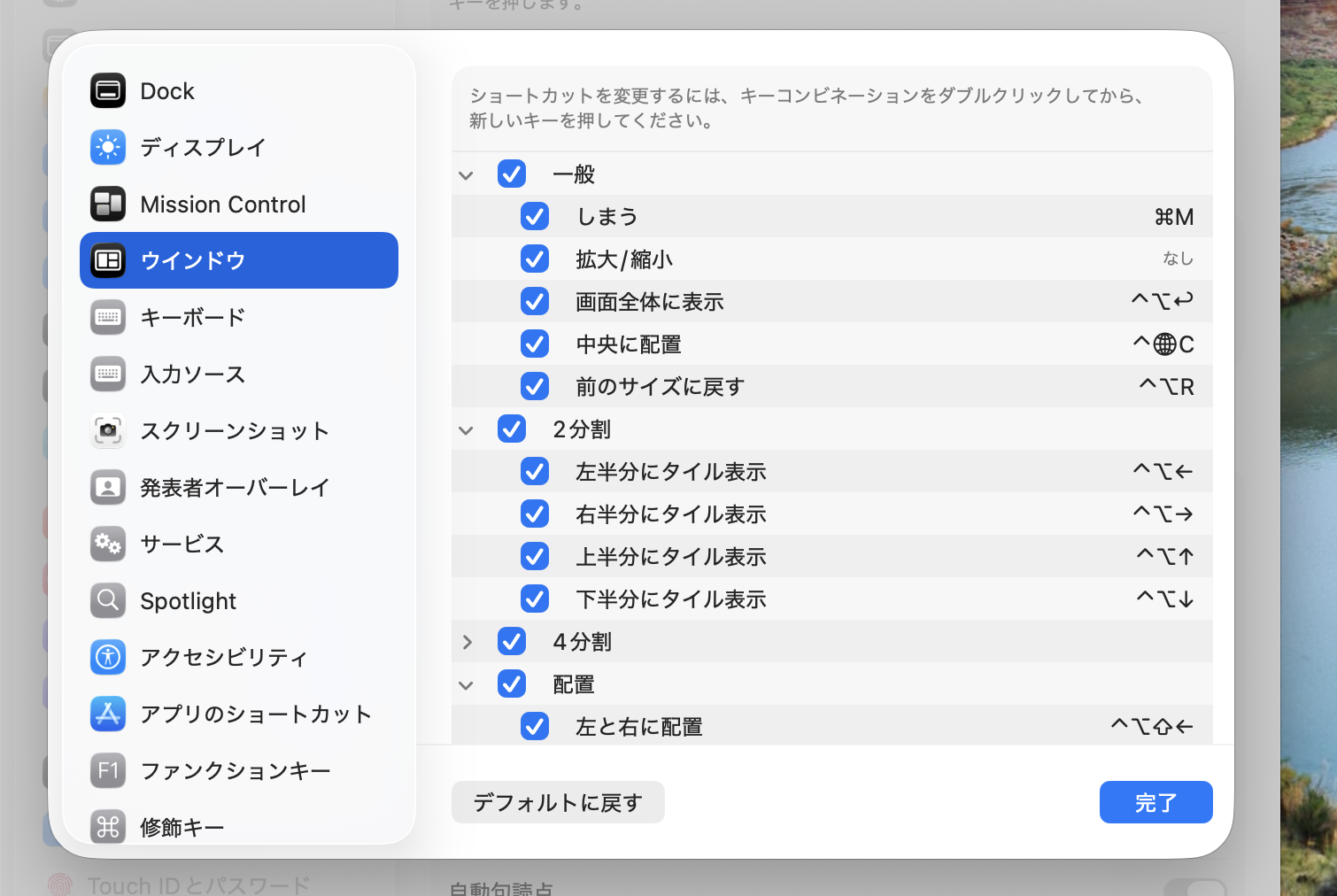 設定→キーボード→キーボードショートカットを選び、表示された画面からウインドウを選ぶと、画面分割のショートカットキーが表示されます。