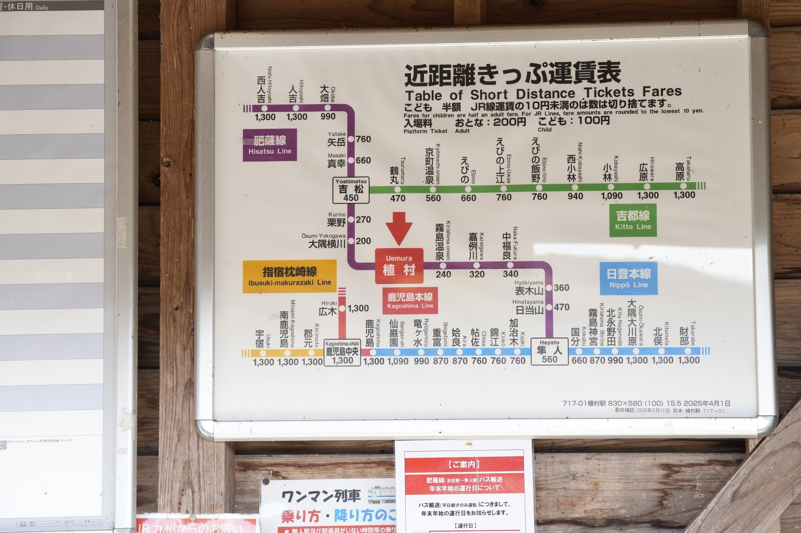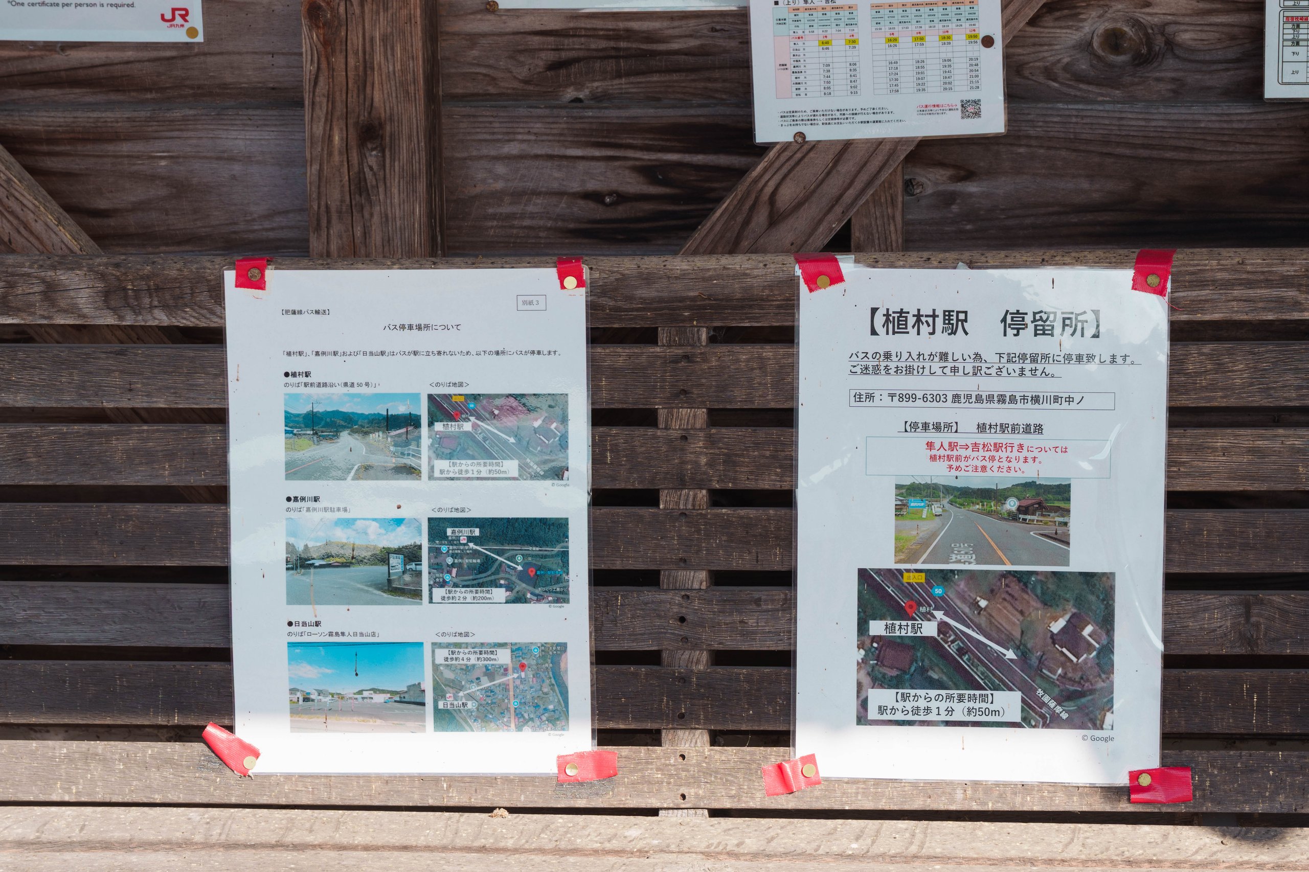 実はこの駅のとおる肥薩線は、2025年8月に豪雨で不通になっているそうで、復活を目指して動いているとのこと。代わりのバスの案内がありました。