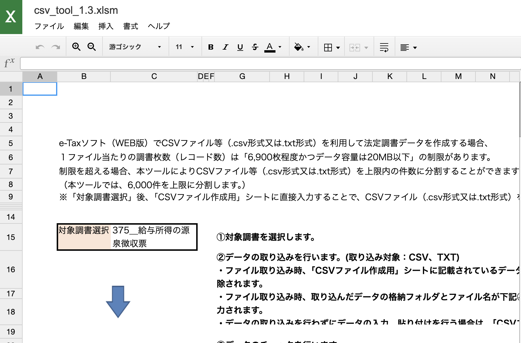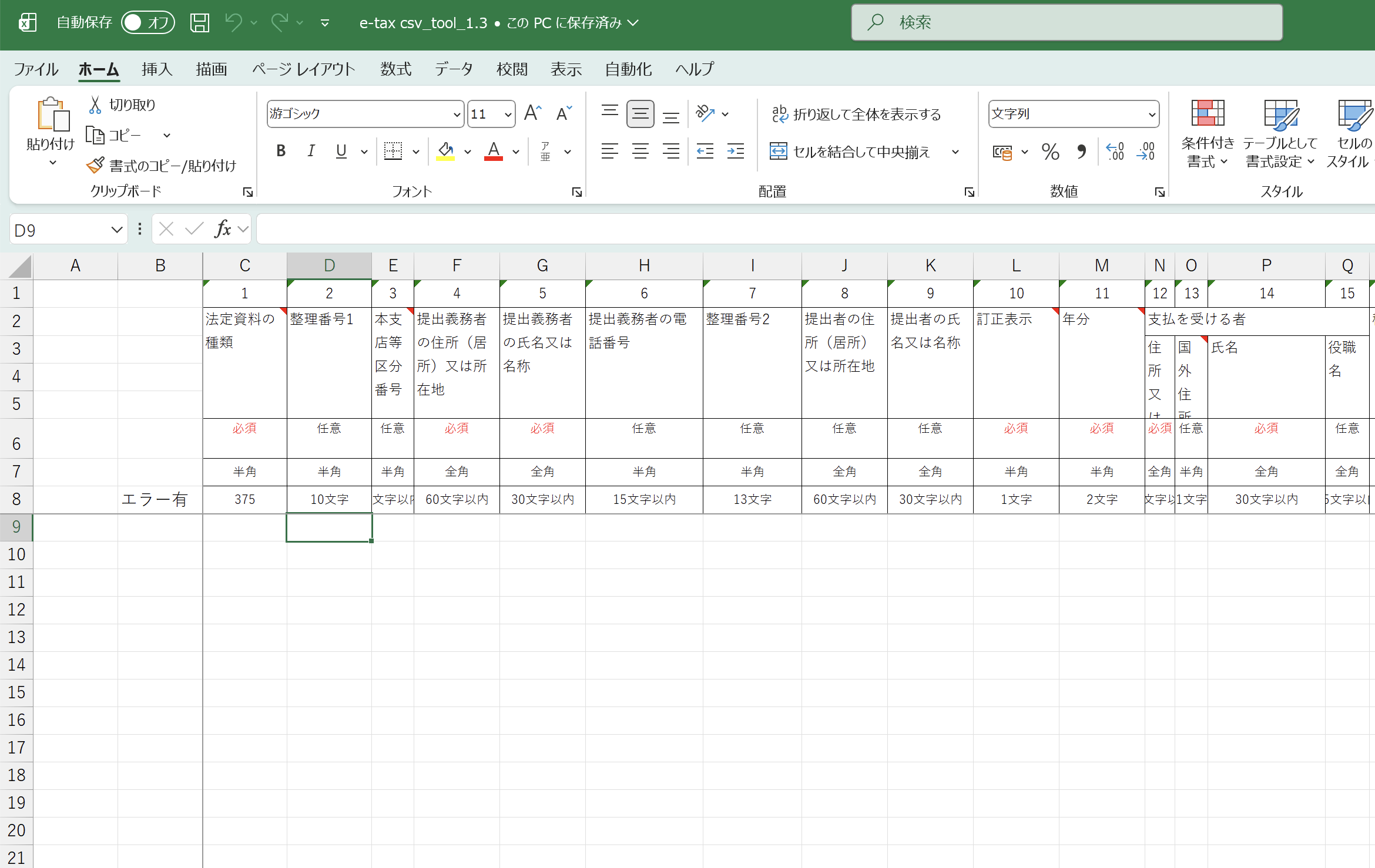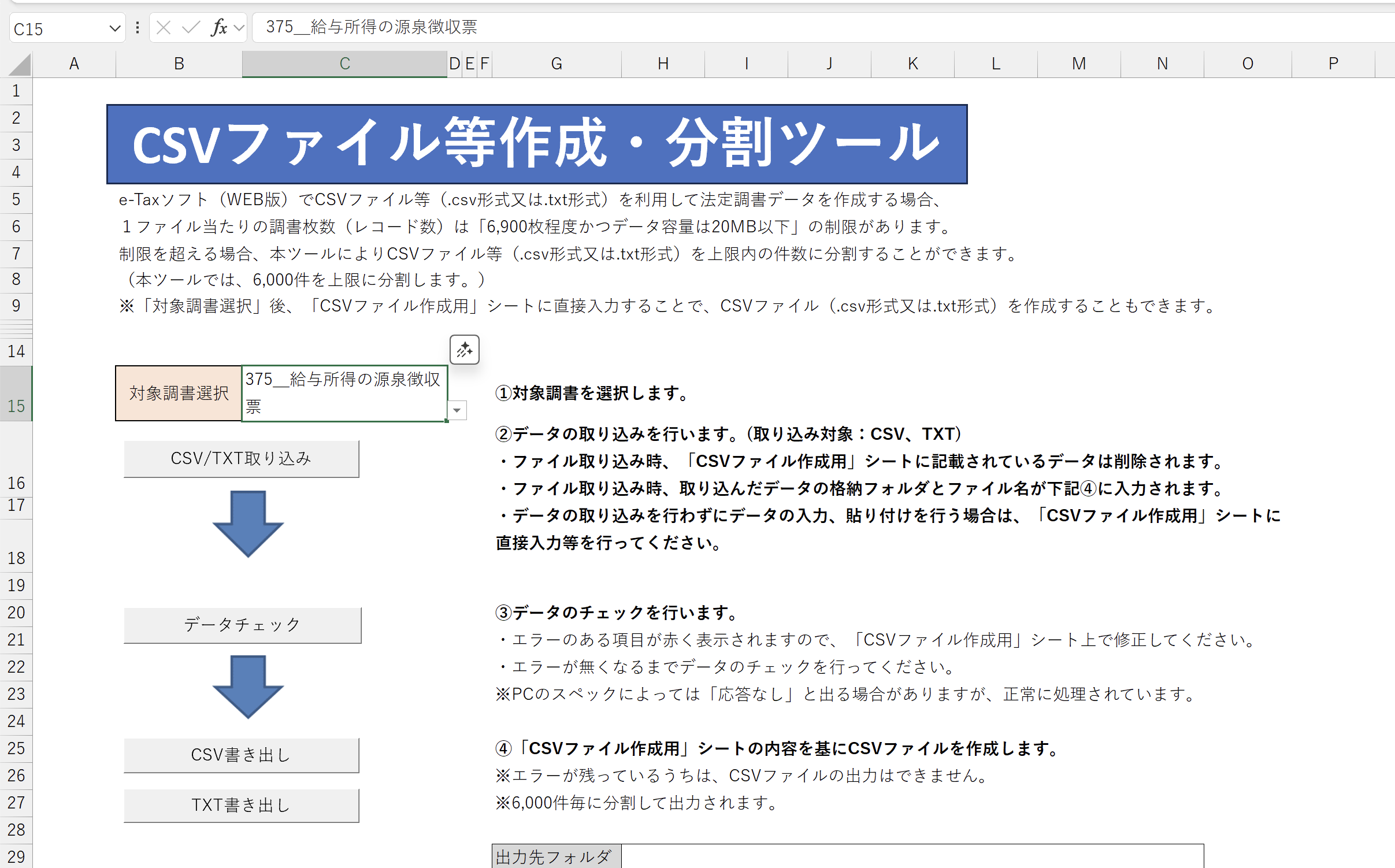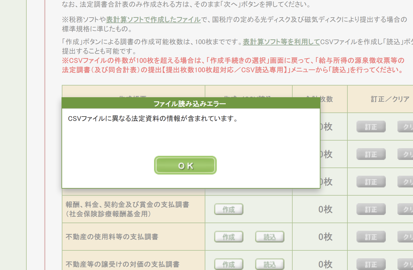 そこでe-taxの「CSVファイル等作成・分割ツール」をダウンロードして、つくっていたCSVファイルを読み込んで、エラーチェックを確認しようと試みました。