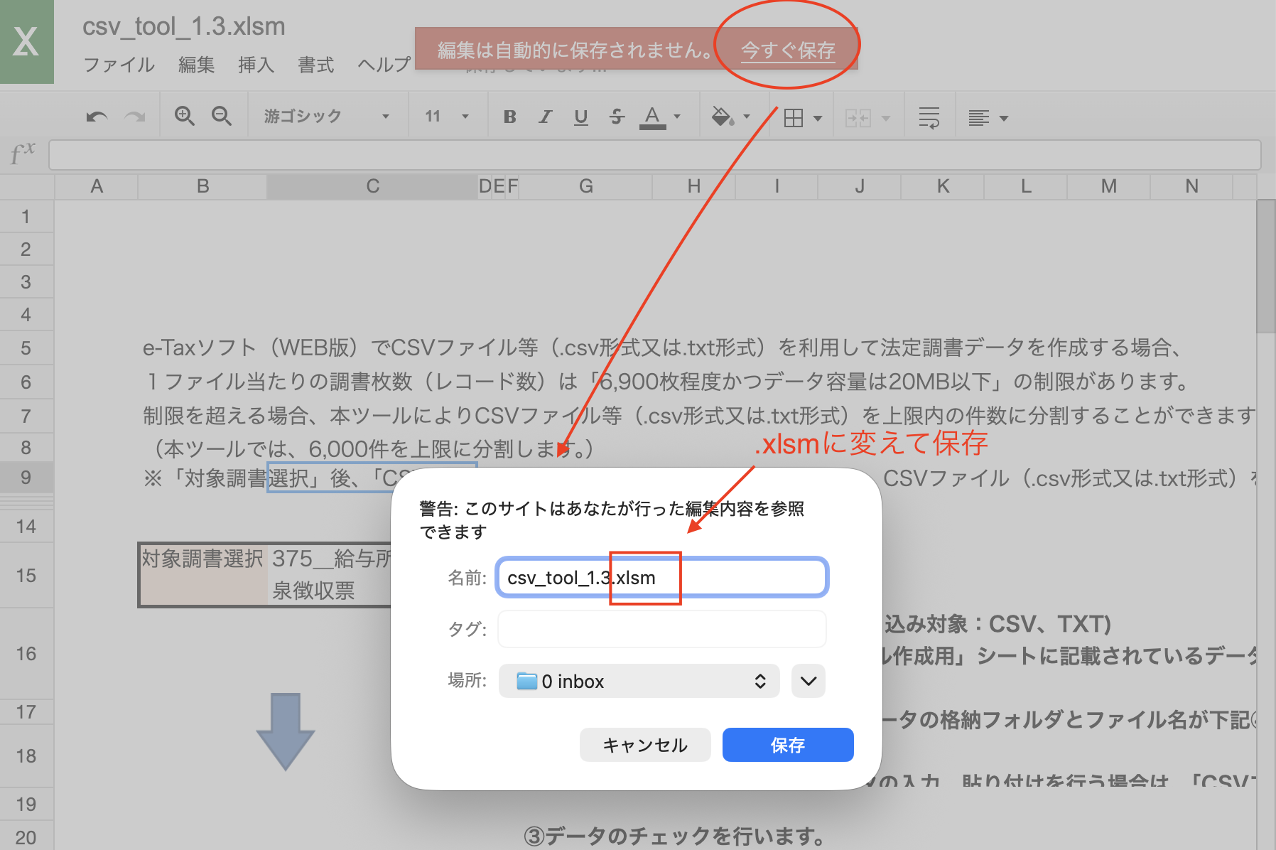 データを変更しようとすると保存できるので、そのときに「.xlsm」のマクロファイル形式で保存するとマクロファイルの状態でダウンロードできます。