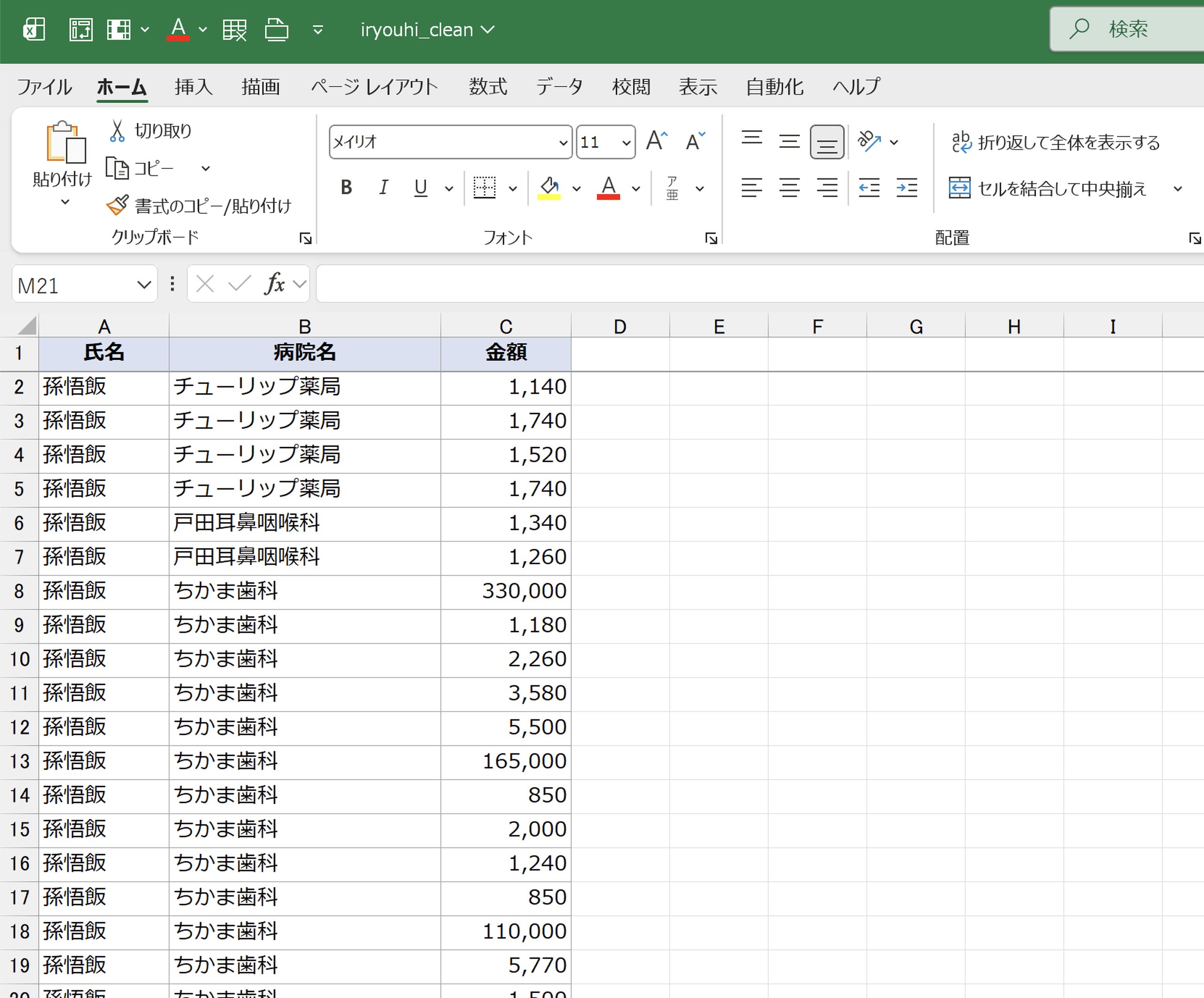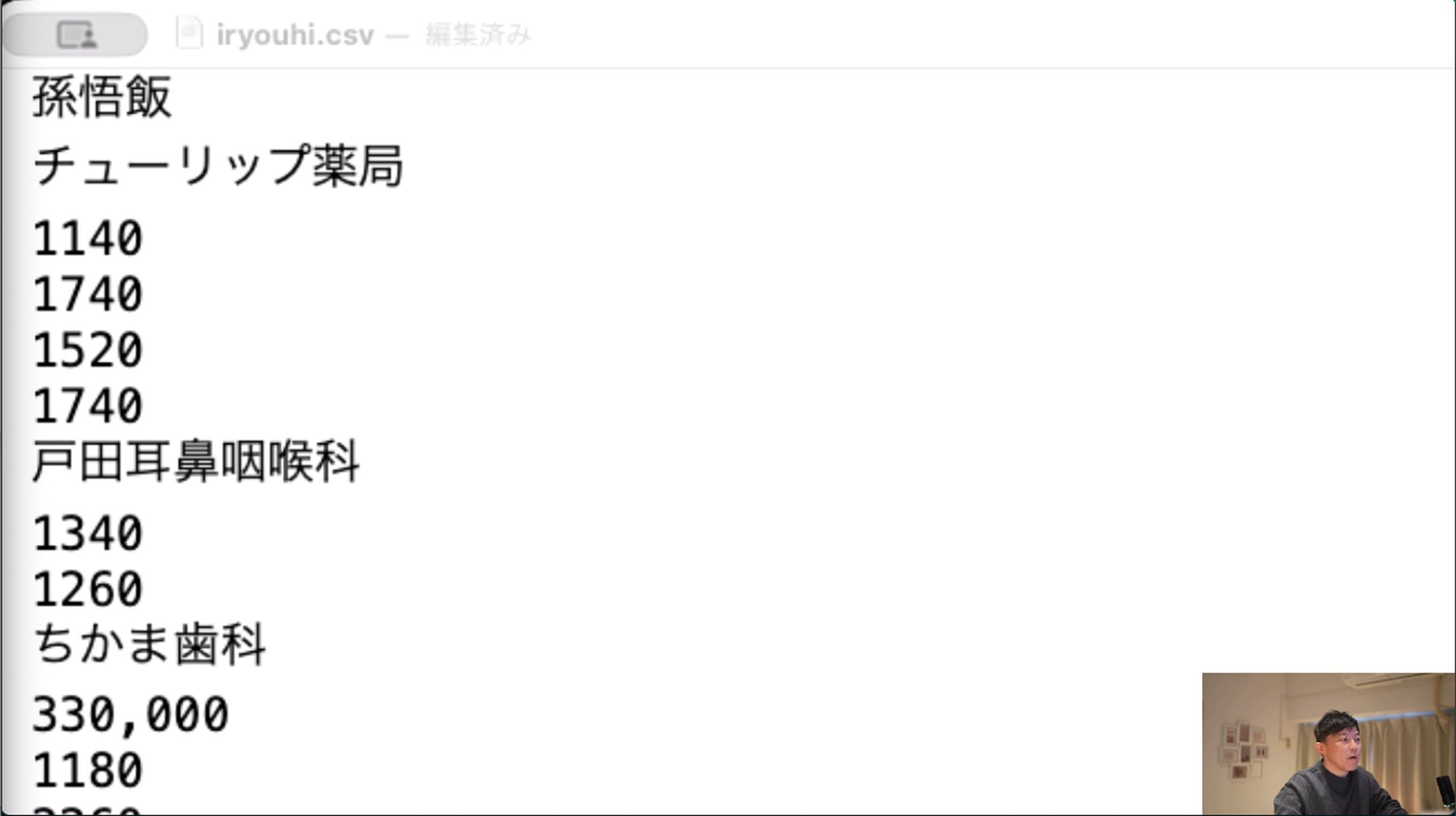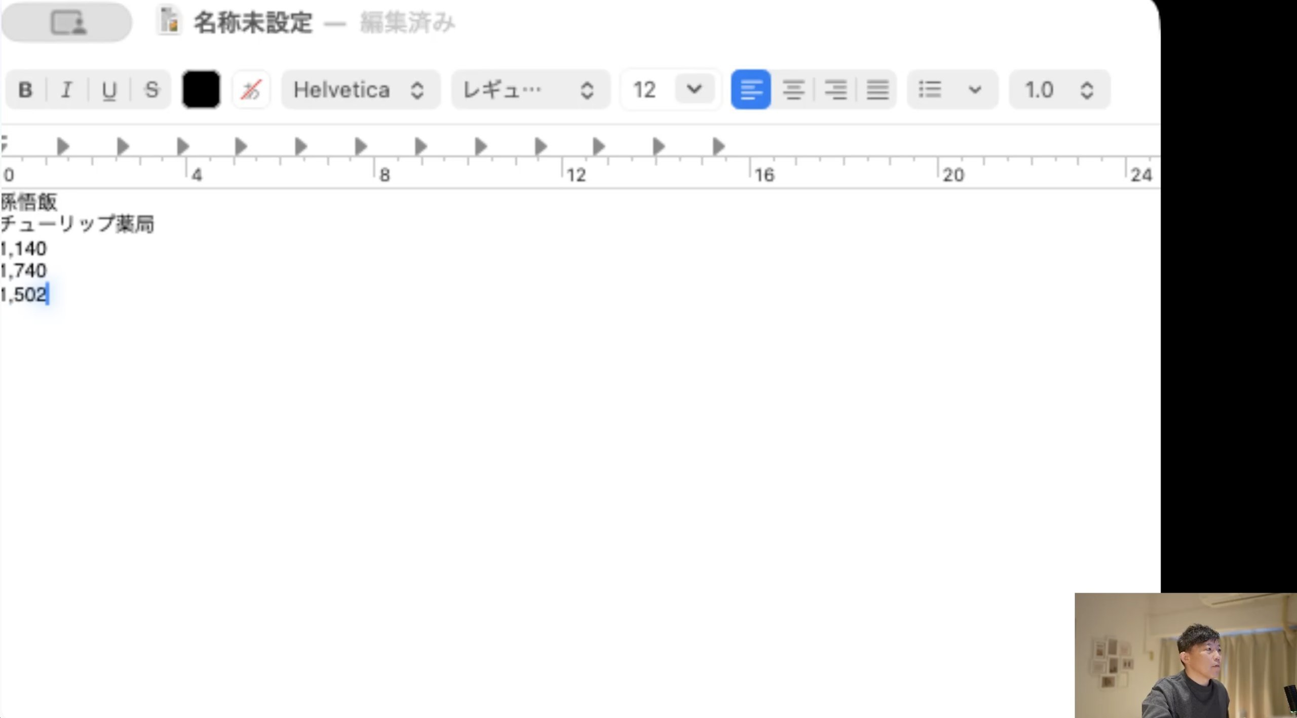 「そんごはん(A列)」、「ちゅーりっぷやっきょく(B列)」、このあとA列、B列のデータが同じなら、C列のデータだけを話していきます。「1140」、「1740」、「1520」というように。(画像は「1520」と伝えて変換途中で「1502」の状態になっています。)
