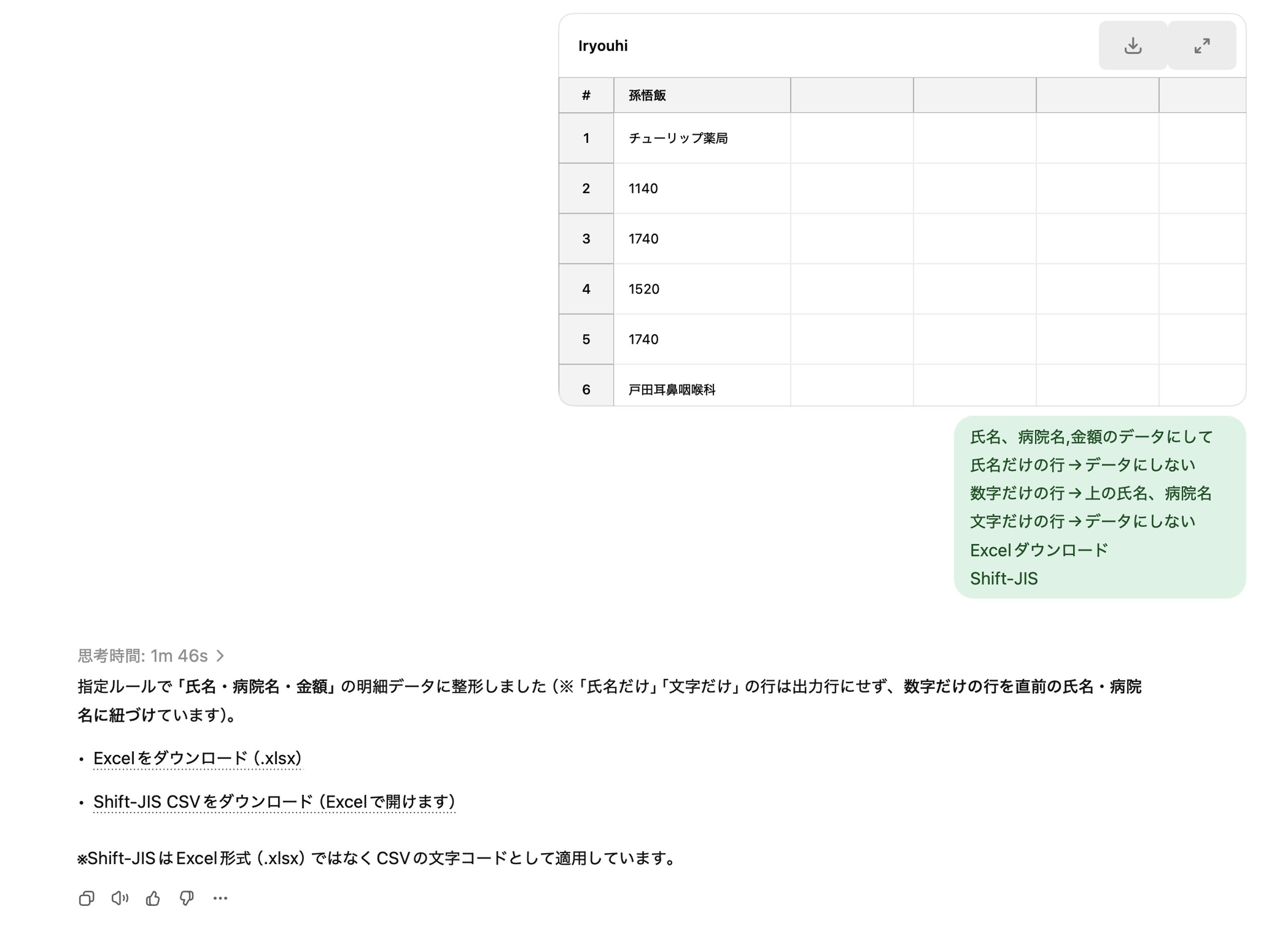 そう話しているうちに、ChatGPTがExcelデータとして加工してくれましたので、ダウンロードしてファイルを開くと、