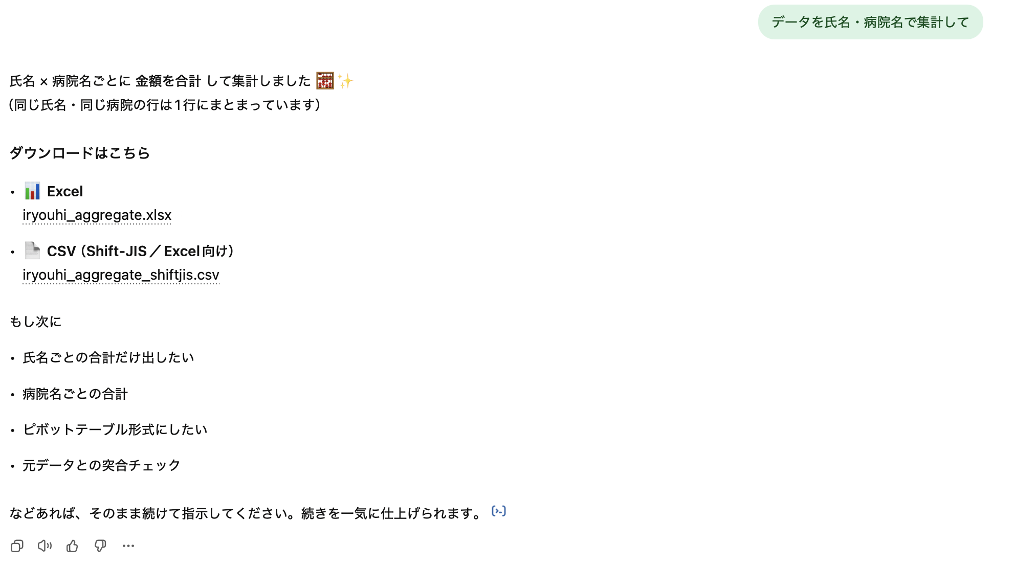 お伝えしたようにデータを整えるところは、ChatGPTにお願いしましたが、集計をChatGPTにお願いすることもできます。