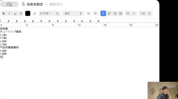 「そんごはん(A列)」、「ちゅーりっぷやっきょく(B列)」、このあとA列、B列のデータが同じなら、C列のデータだけを話していきます。「1140」、「1740」、「1520」というように。(画像は「1520」と伝えて変換途中で「1502」の状態になっています。)