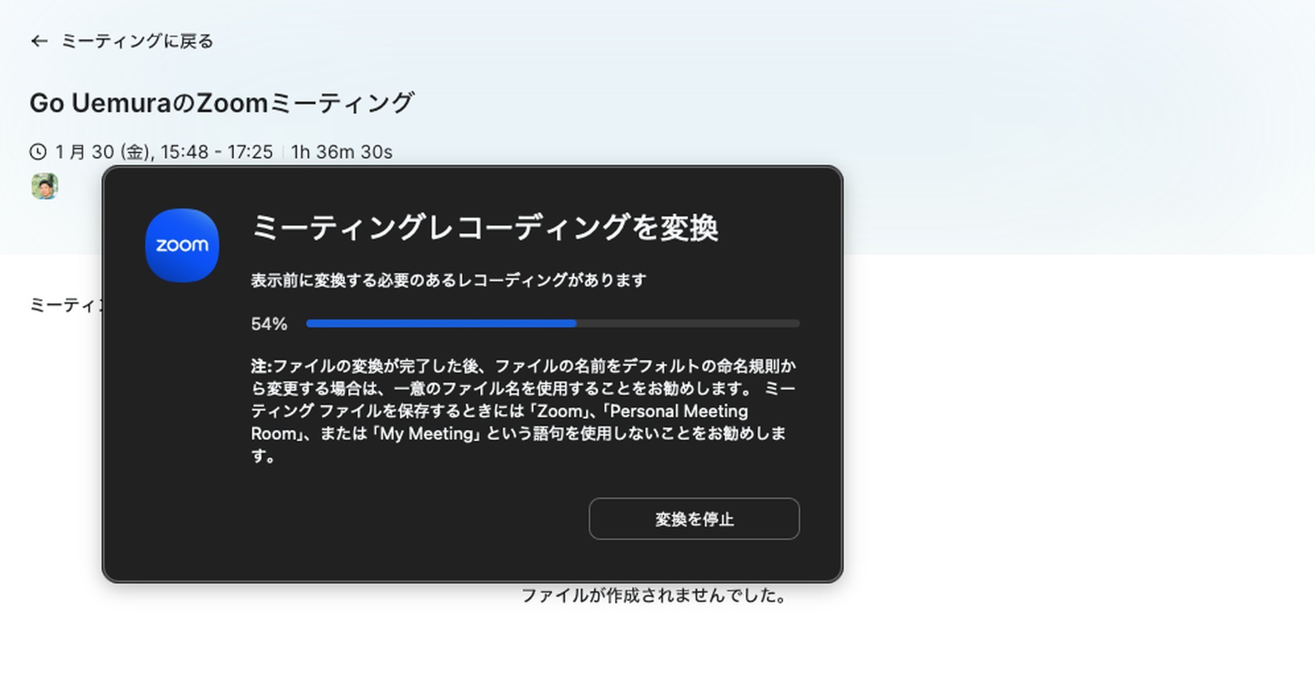 終了すると自動で動画ファイルがinboxのフォルダに保存されるはずですが、OBSで収録したはずの動画はなぜか保存されておらず。いっぽうで、Zoomで収録した動画ファイルも一瞬は「ないじゃん?」と思ったものの、Zoomから生成されたフォルダ内にMP4ファイルが無事、格納されていました。