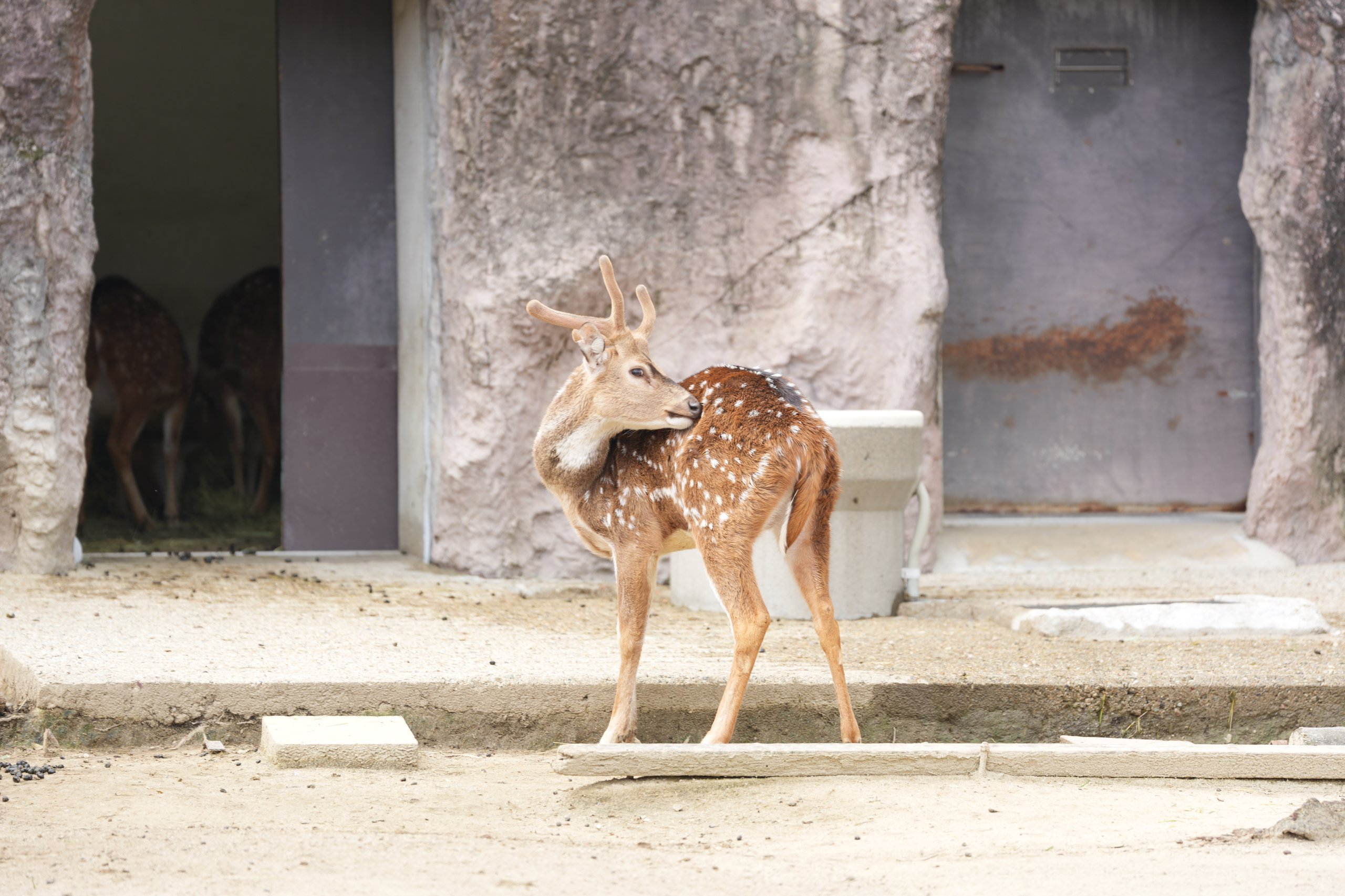 先日、動物園で見かけたのは、鹿が首を後ろに向けて背中をかいているシーン。