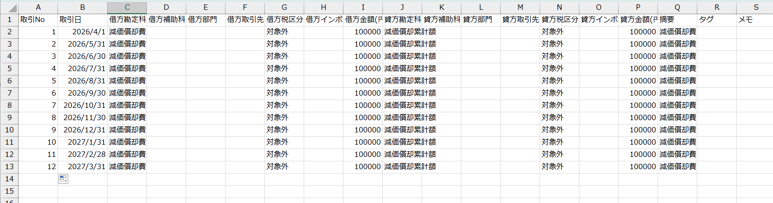 会計ソフトのインポートのデータ形式は簿記のルールに沿ったもの。列数が多すぎます。ただ、見てのとおり空欄の列も多いです。いらない列はインポートのときになくても大丈夫です。