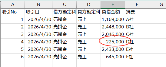 マイナスの金額のままでインポートをすると、どうなるか?会計ソフトが判断して勝手に反対仕訳にしてくれます。