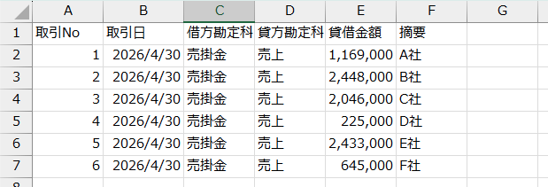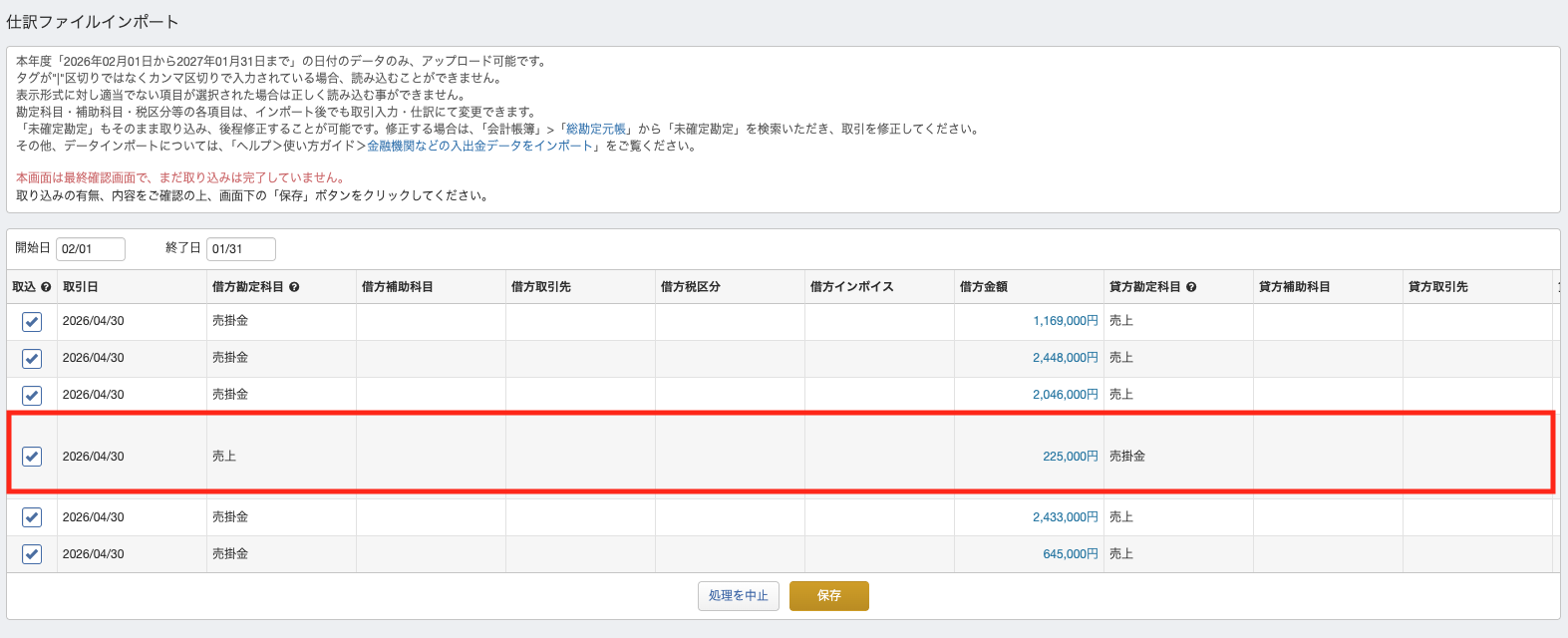 たとえば、売上の仕訳データをインポートするなら、最低限のデータで足ります。