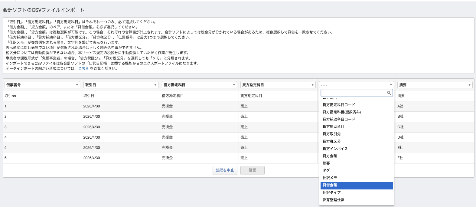 マネーフォワードの場合、Excelの見出しから自動でインポートの見出しも判断してくれますが、なぜか貸借金額だけ自動で設定されない謎仕様…。ただ、会計ソフトのように借方金額、貸方金額とそれぞれ入力しなくてもいいわけです。