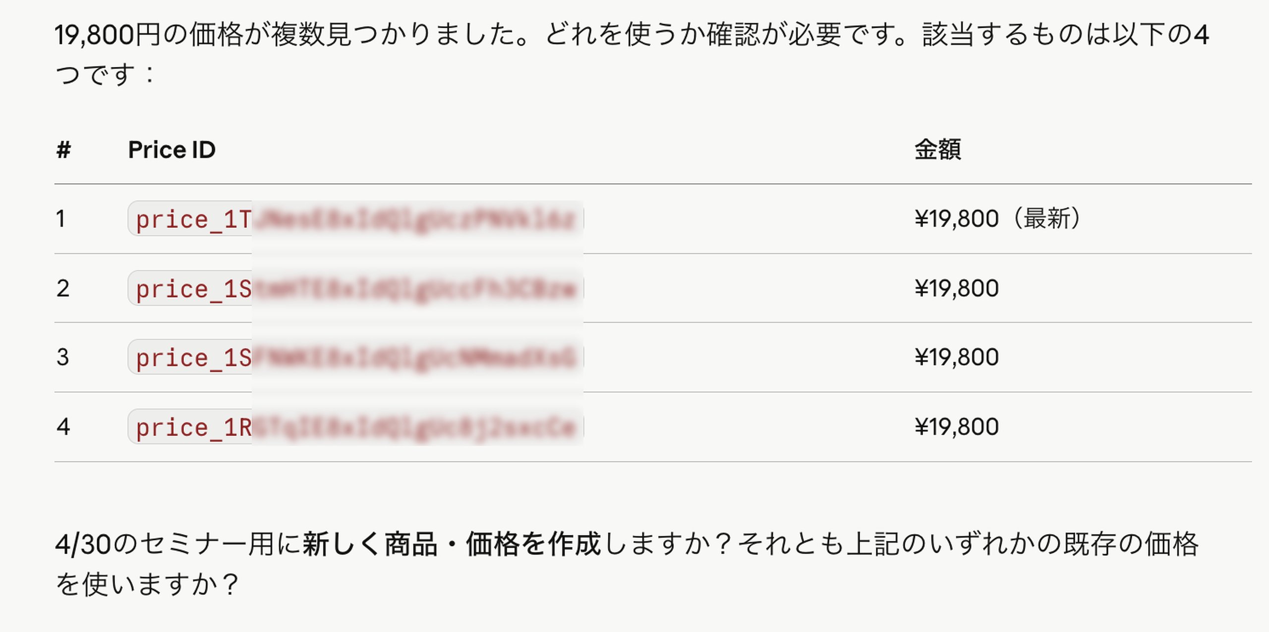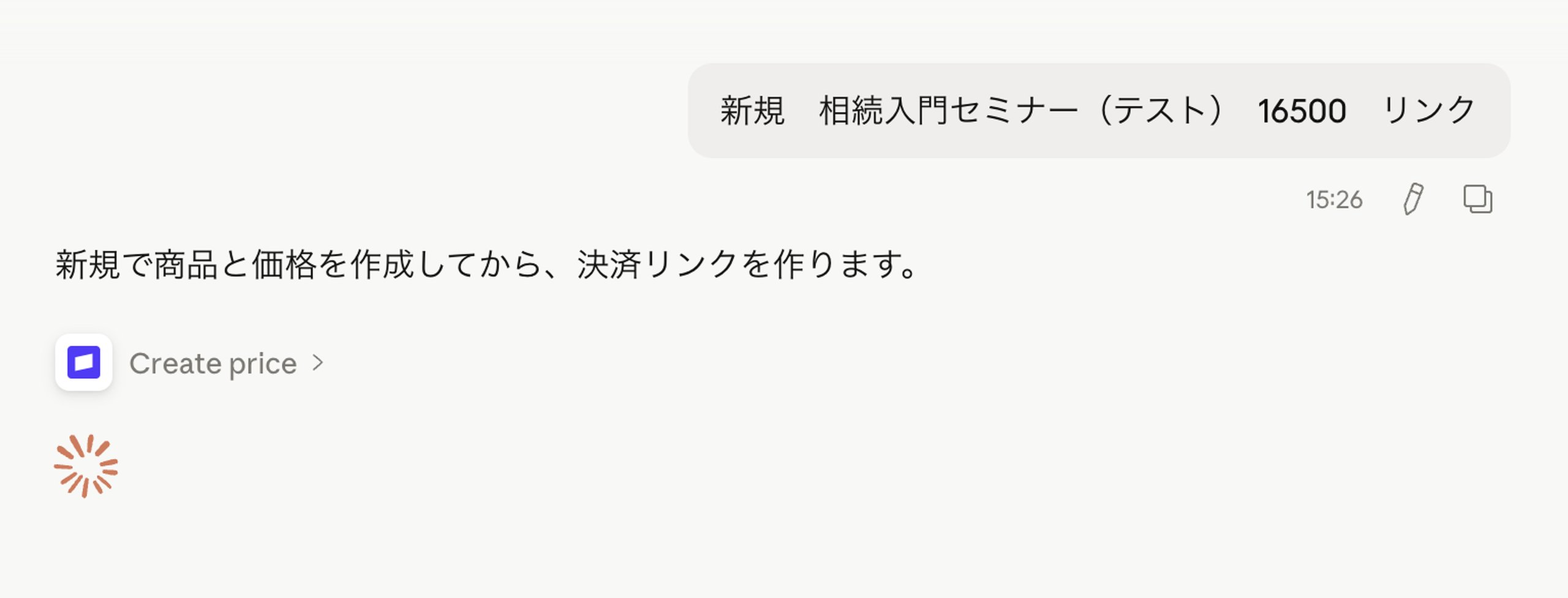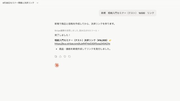 では、Claudeで決済リンクをつくってみます。日付とセミナー名、決済リンクと金額を入力してみると、新規でつくる前にすでにリンクがつくってあるか、ダブらないように確認してくれます。確認なしでつくることもできます。