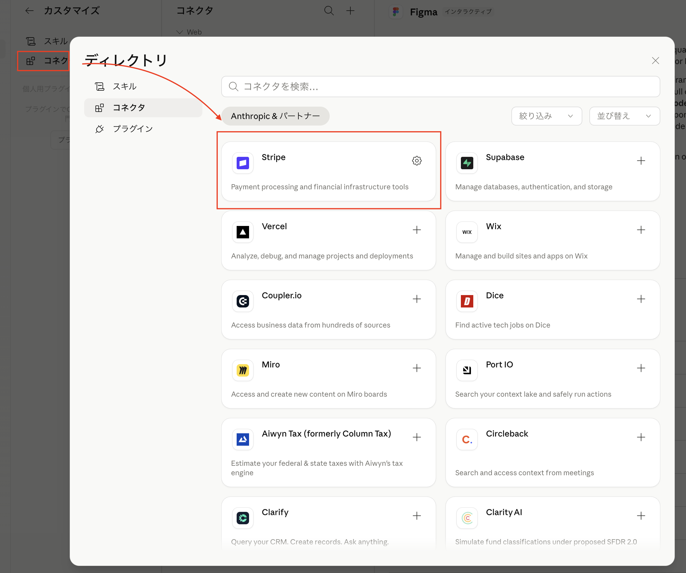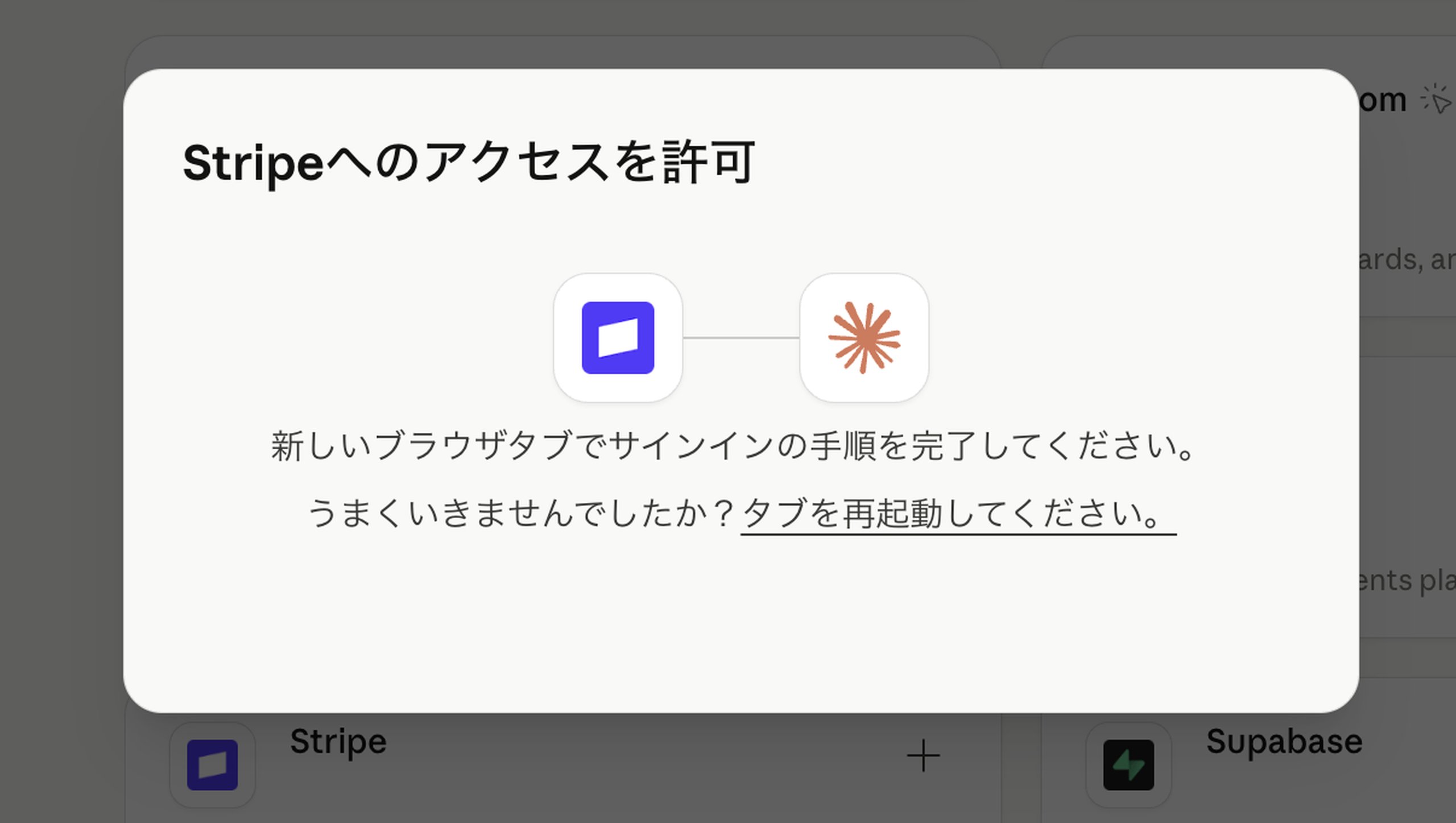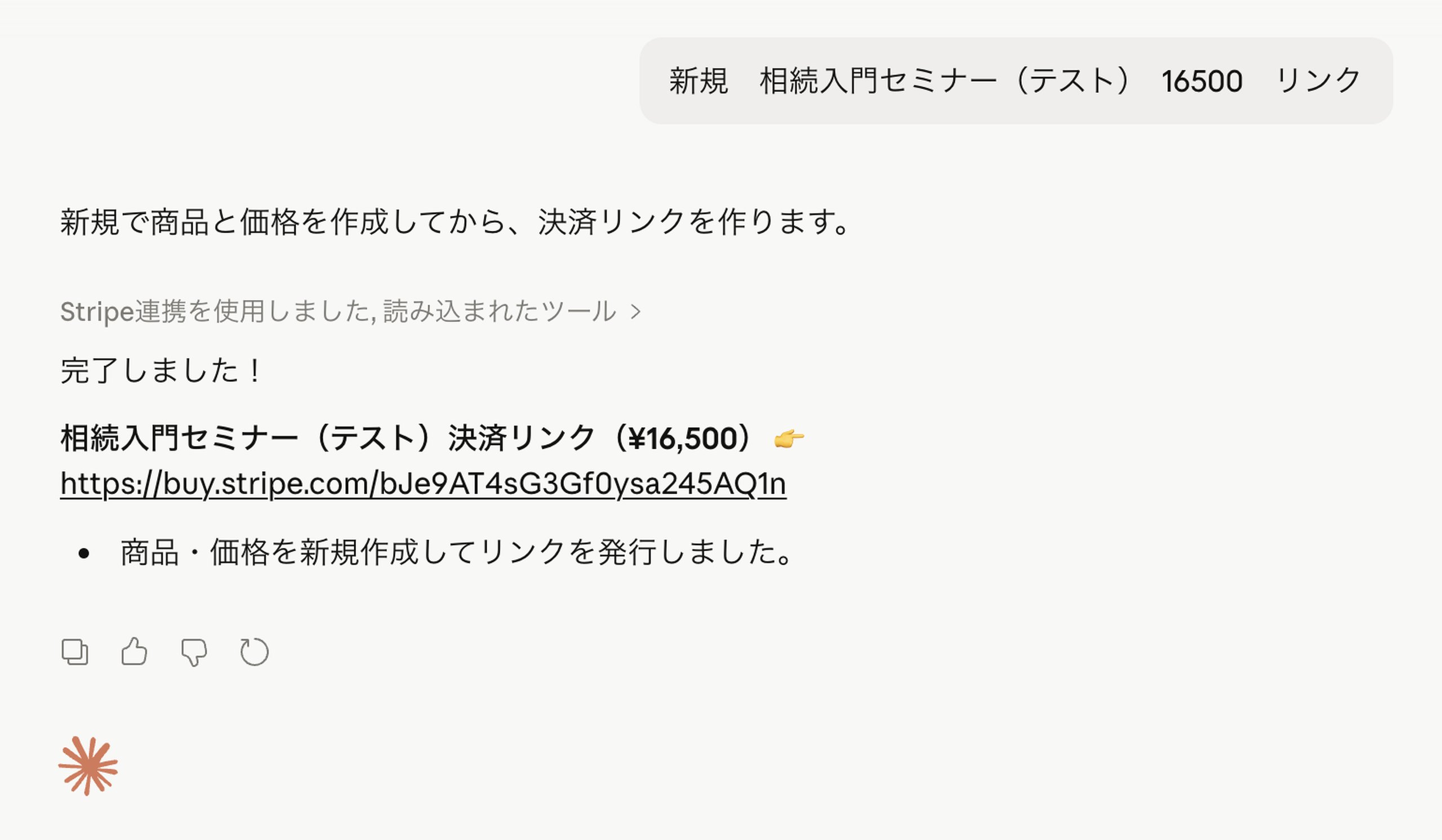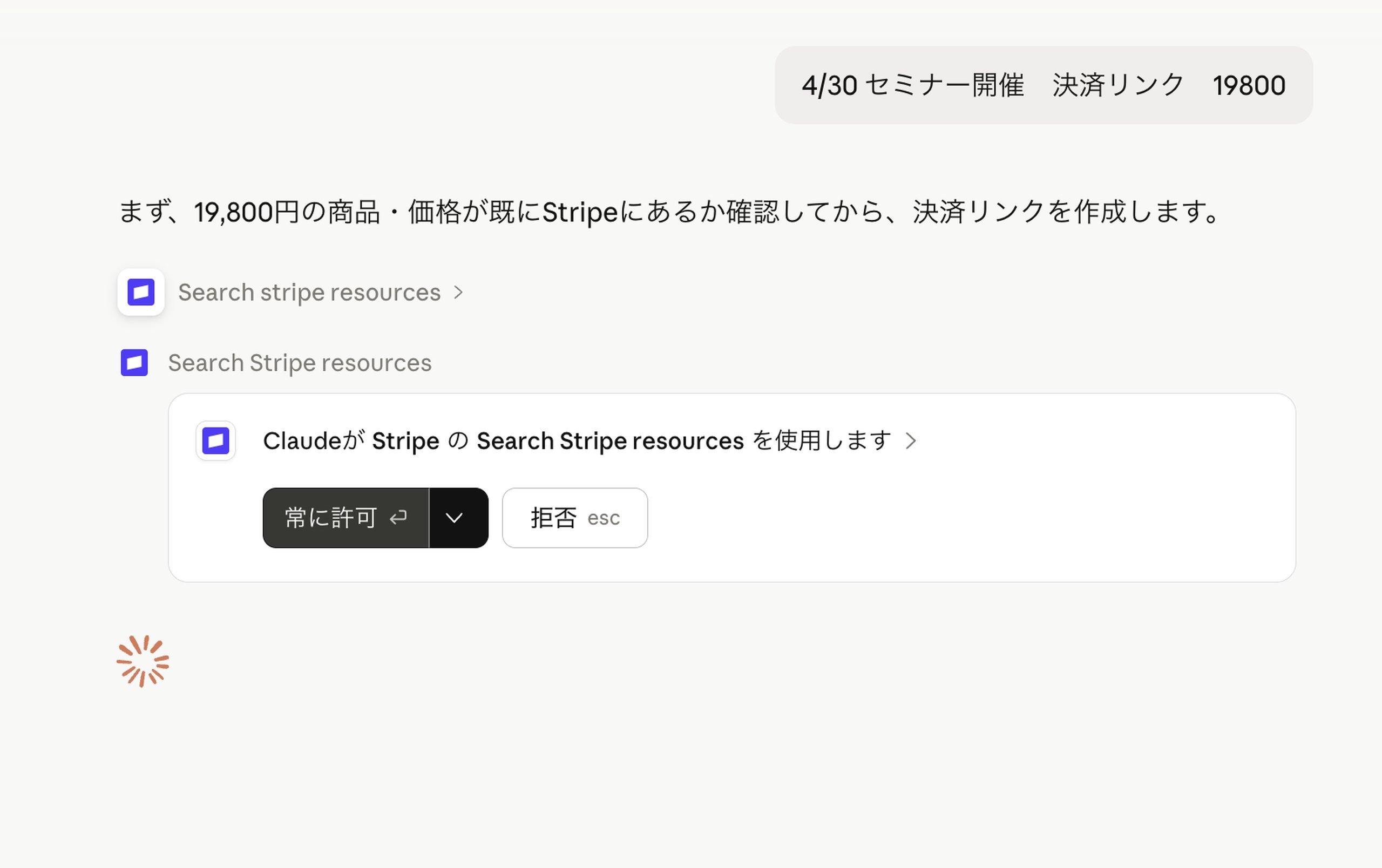 アプリとの連携もできます。今回やってみたのはClaudeで決済リンクをつくる流れです。