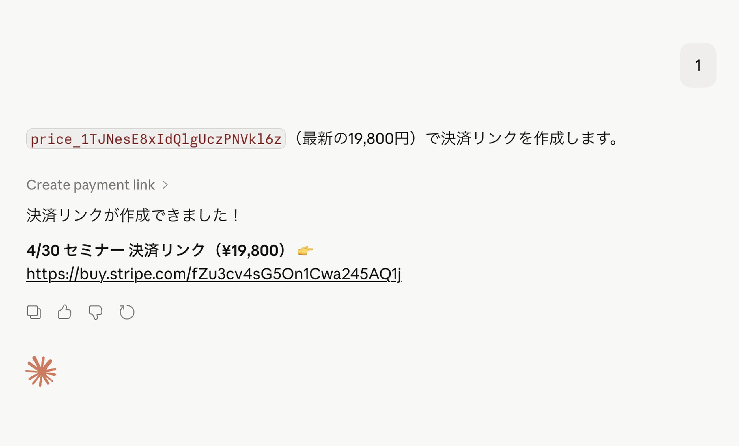 新規でリンクをつくるか、既存のリンクを使うかを選べます。試しに「1」を選んでみると、最新のセミナーの決済リンクを書き出してくれました。日付はなくてもよかったなと。