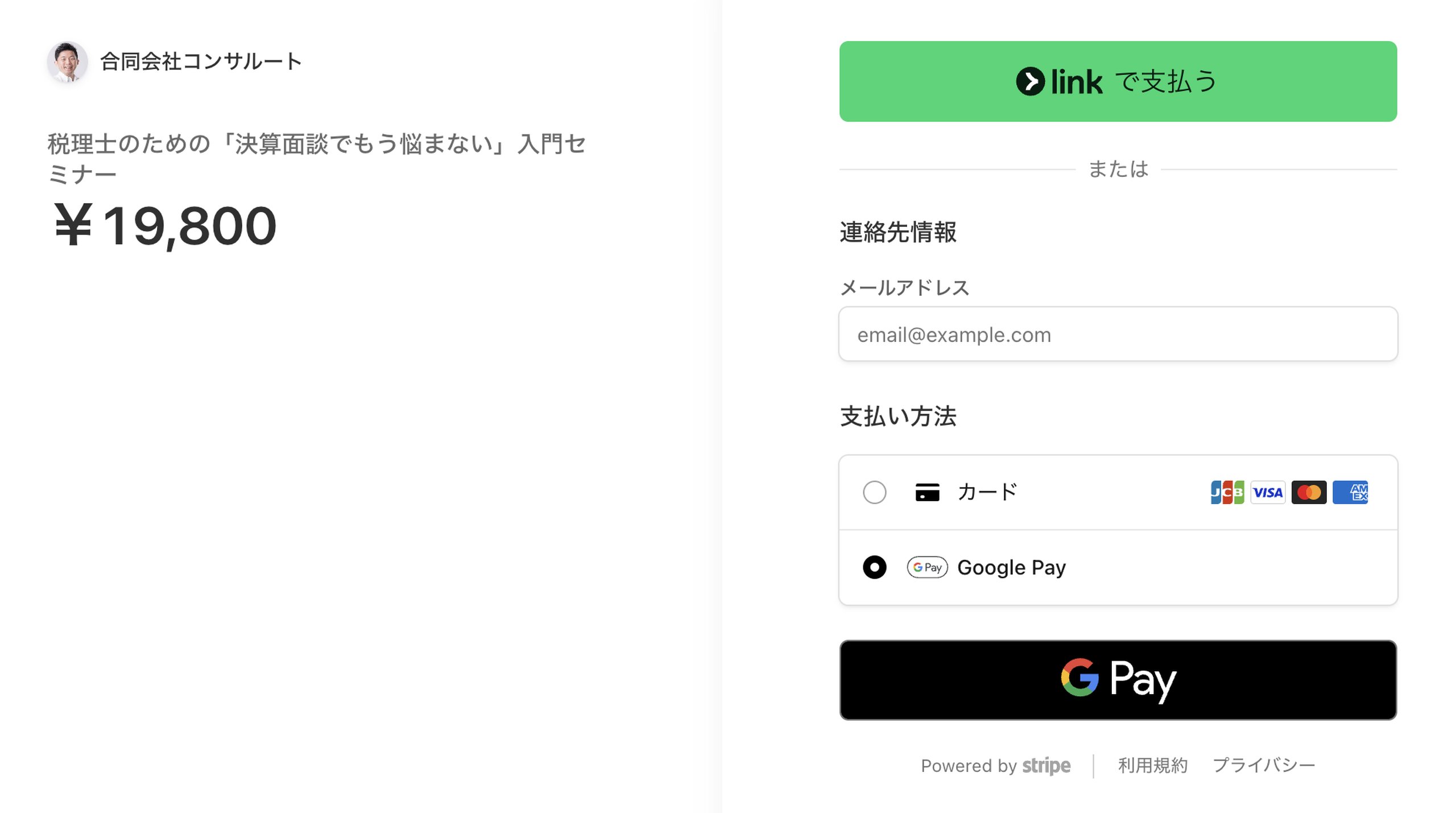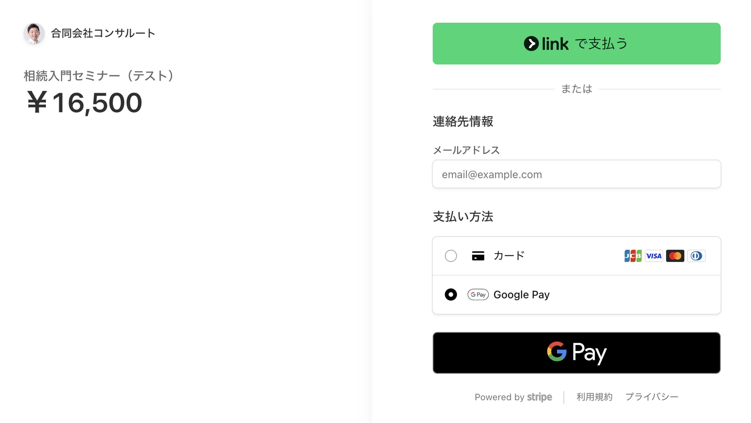 決済リンクをつくる動きがあり、10秒ほどで完成しました。このリンクをクリックしてみると、