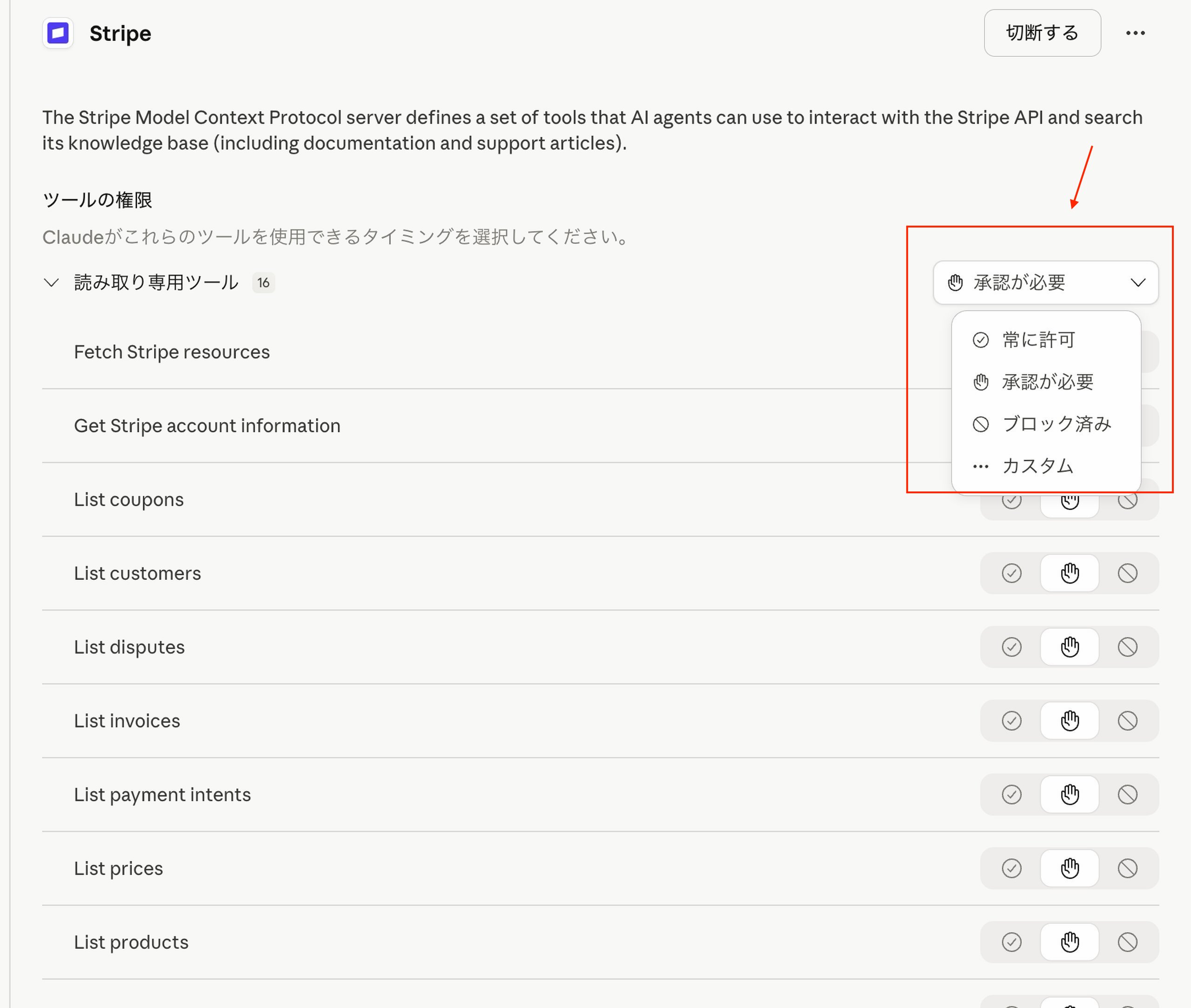 連携ができたら、ClaudeからStripeの処理をお願いすることができるようになります。許可のレベルを確認しておきましょう。
