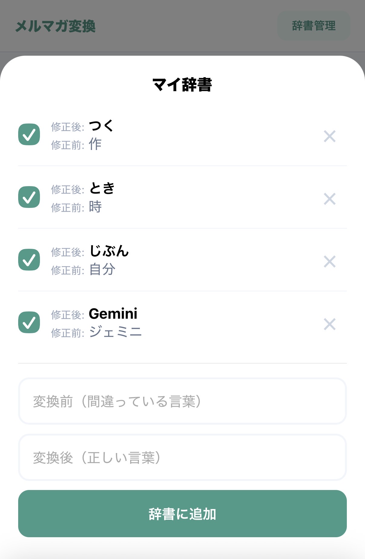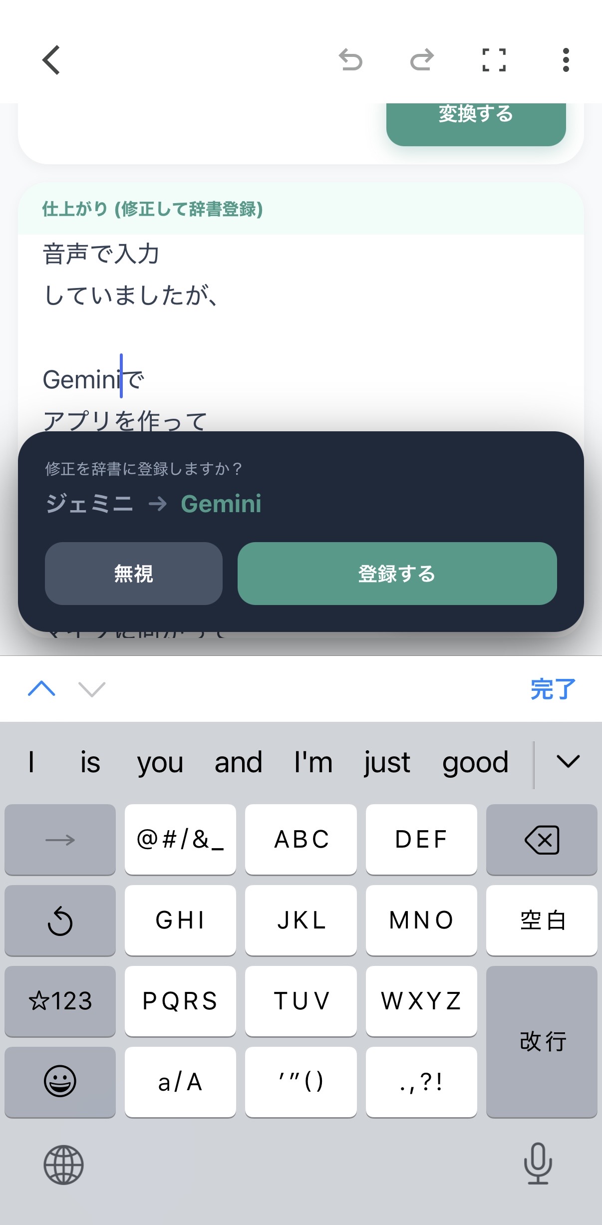 単語を見直すと、辞書に登録するかを選べるという仕様。わたしがGeminiにお願いした仕様です。最初、文章を変えても変換候補として表示されたので、「もし単語だったら」とヒトが伝えないといけないです。