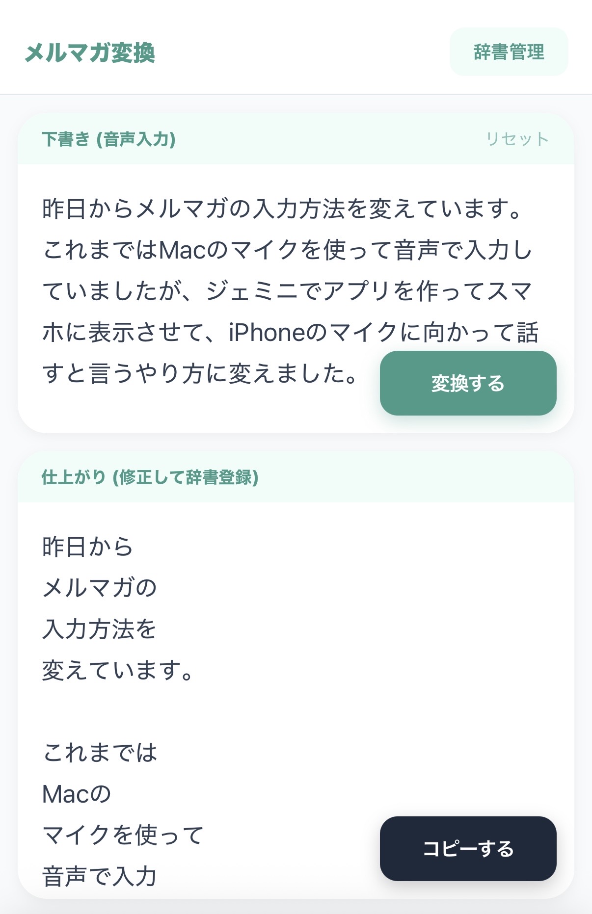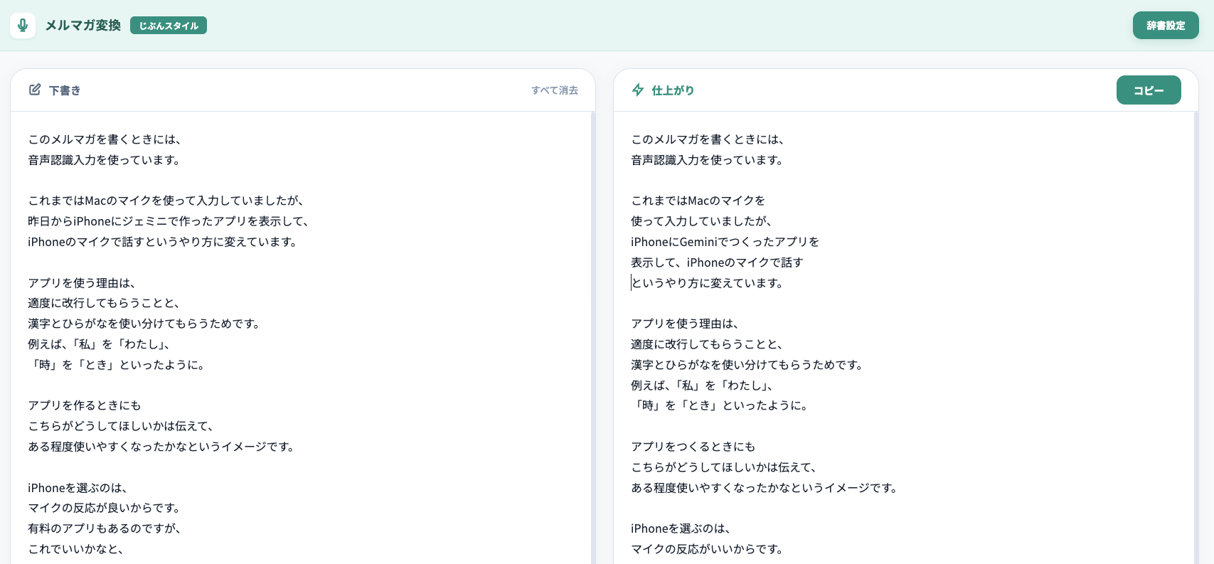 これまでのMacの音声入力を使って書いた文章をメルマガにコピペしていましたが、GeminiでつくったアプリをiPhoneで起動し、iPhoneのマイクで話して入力するやり方に変えたのです。