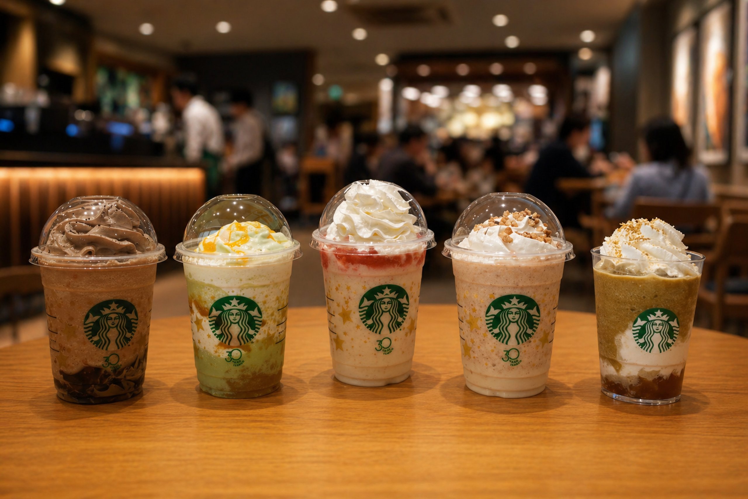 今、スタバで30周年記念で「THE スター フラペチーノ」という企画をやっていて、過去に人気があった5種類のフラペチーノをお店ごとに1つ、販売しているのです。